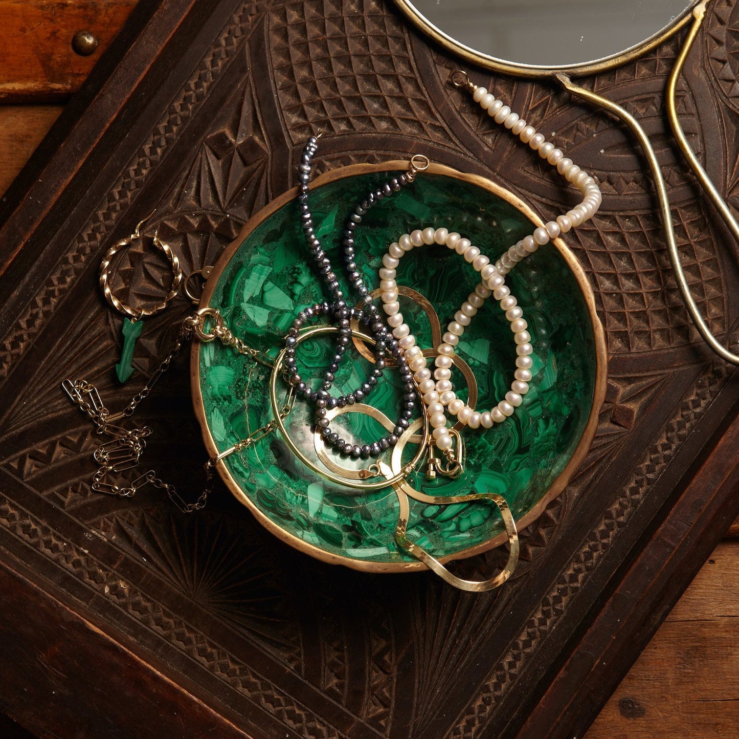 Please take care of your treasures. We use semi precious stones and pearls, which are delicate in nature. Avoid scratching, don't swim or shower with them and keep them away from chemicals, perfume and creams.